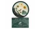 Čakrová sviečka zo 100 % prírodného sójového vosku s pravými drahými kameňmi vybavená dvoma drevenými knôtmi, ktoré pri horení jemne praskajú.