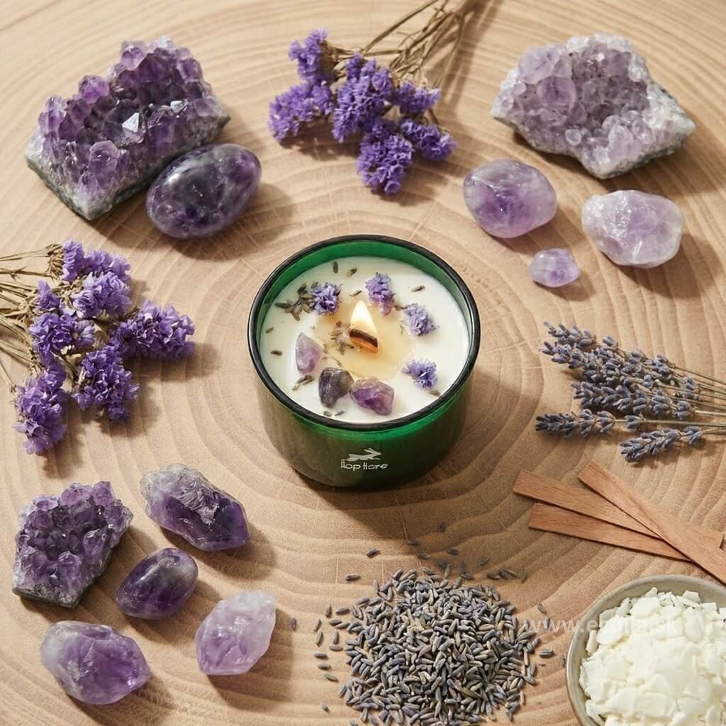 - Ametyst a sušené levanduľové kvety vo vnútri sviečky - výnimočný detail, ktorý v bežných sviečkach nájdete len zriedka
