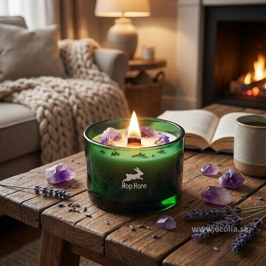Sviečka je uložená v elegantnej tmavozelenej sklenenej nádobe a doplnená dreveným knôtom, ktorý navodzuje útulnú, domácu atmosféru a pripomína plameň v krbe. Vo vosku sa nachádza prírodný ametyst spolu so sušenými levanduľovými kvetmi, čo dodáva sviečke jedinečný vzhľad a robí z nej aj krásny dizajnový doplnok do interiéru.