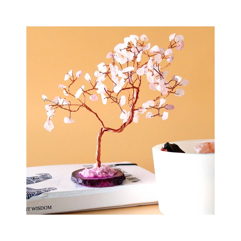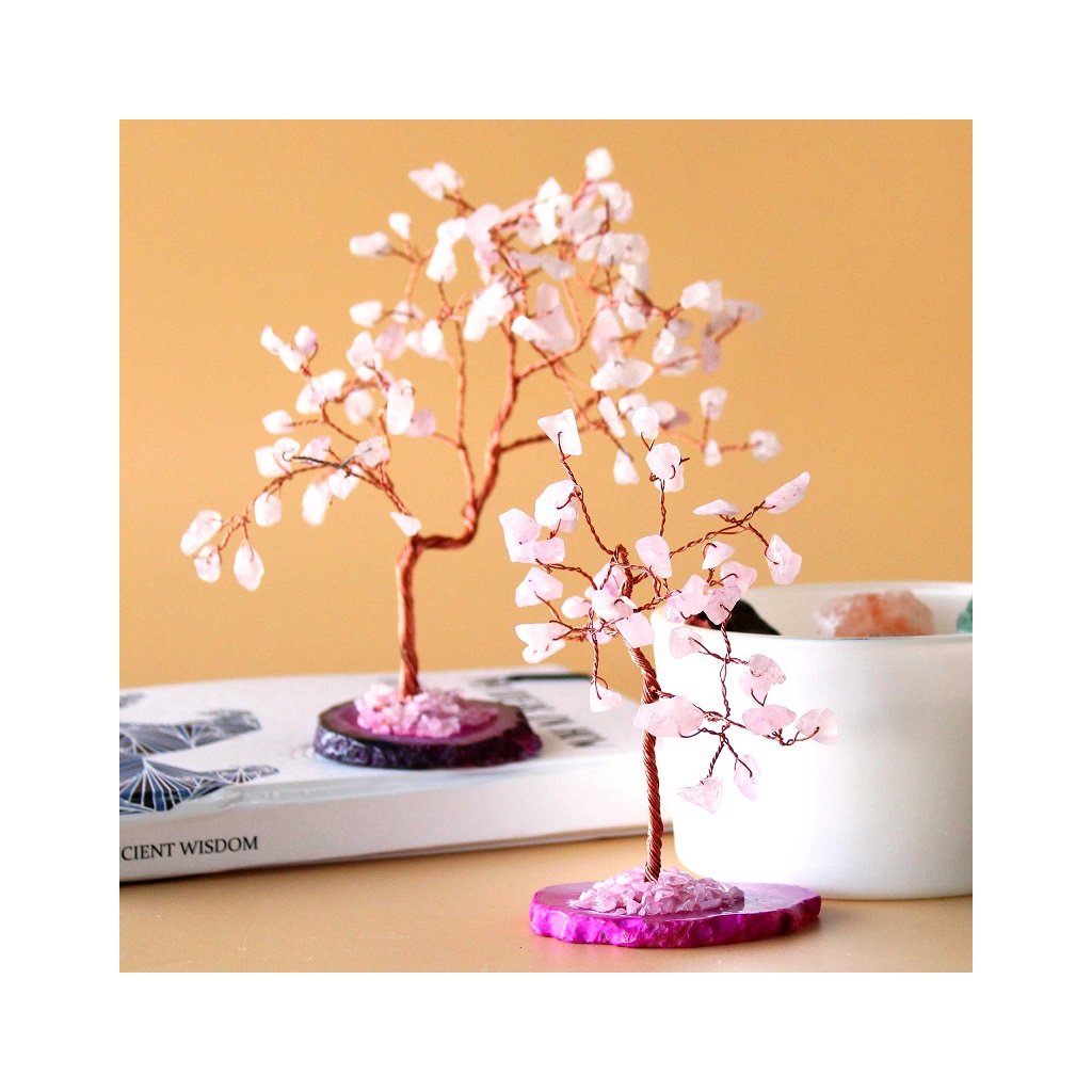 Každý stromček stojí na podstavci z prírodného achátu, ktorý dodáva stabilitu a vizuálnu hĺbku celému dielu. Jemné ružové tóny ruženínu v kombinácii s medenými vetvičkami vytvárajú harmonický a upokojujúci dojem, ktorý vynikne na pracovnom stole, v obývačke, spálni aj darčekovej vitríne.
